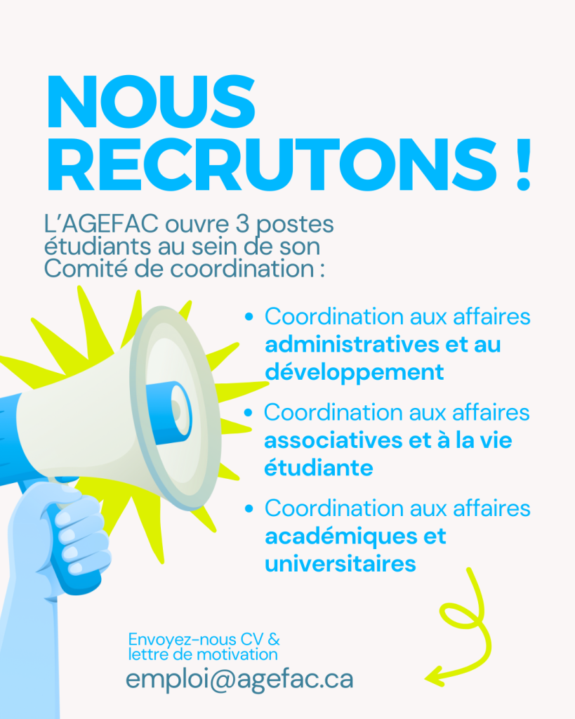L’AGEFAC ouvre 3 postes étudiants au sein de son Comité de coordination (COCO) :
